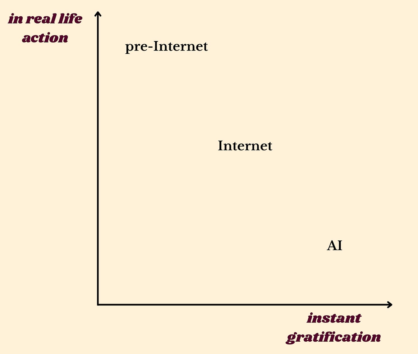 AI companions provide boundless intimacy without any actual interpersonal discourse or empathy. Junior developers rely on AI autocomplete instead of learning programming fundamentals. Slop content is flooding social media in a push to gain status while driving little underlying human insight. People are editing themselves into imaginary scenes for social media they will never experience.