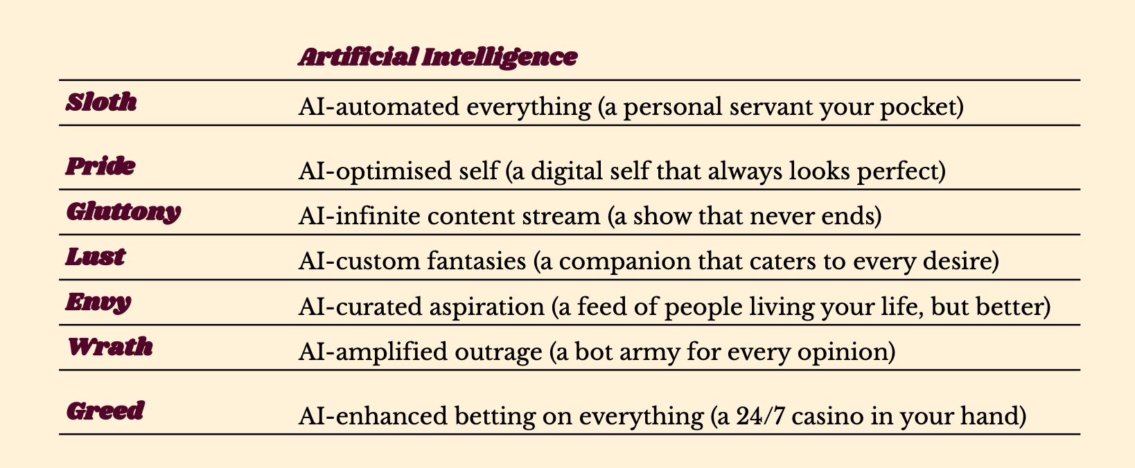 The line between productive and destructive vices has always been thin. Industries built around greed, lust and pride have long carried serious harms, even without AI. But with AI, our vices are optimised past the point of any usefulness. The human striving that once pushed us into the world and bound us together weakens as desires are met instantly and in private.