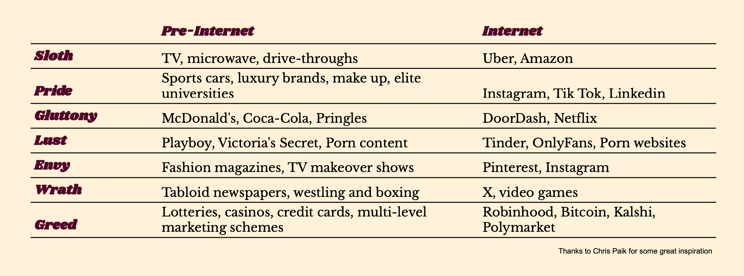 Chris Paik reframed the seven deadly sins as humanity’s seven core motivators: “They are time-tested core motivators that incentivise people to do things.”