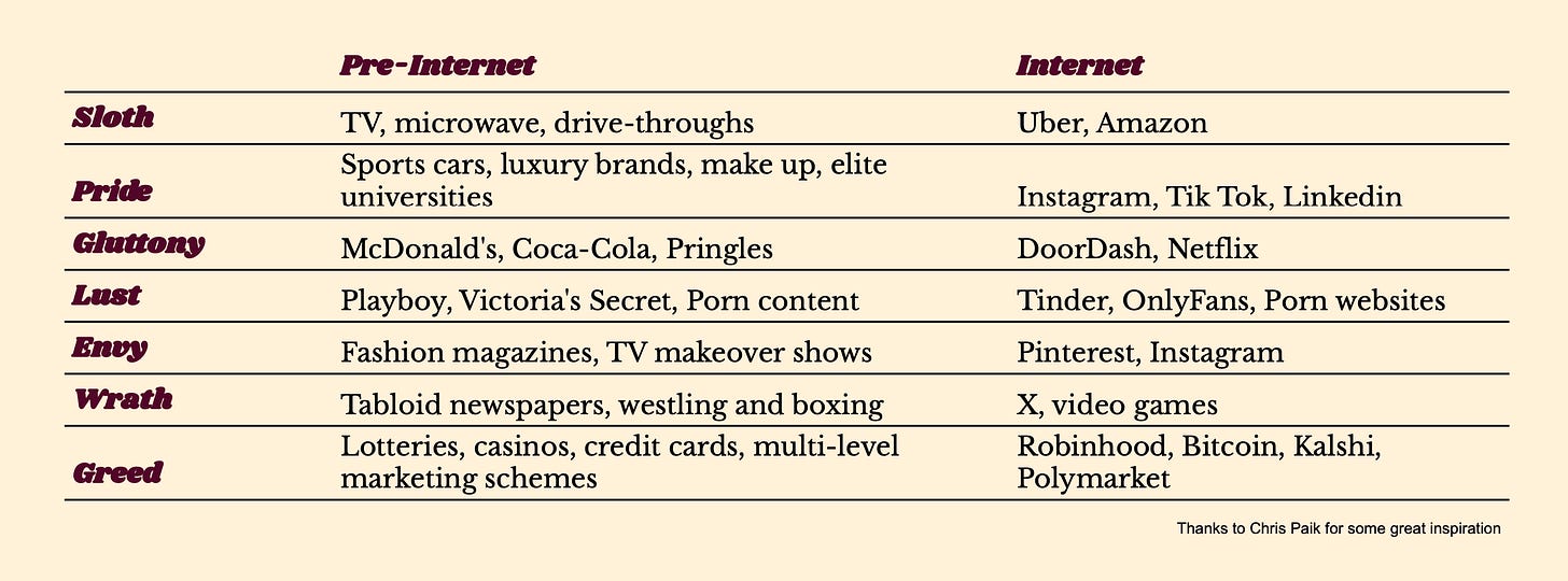 The commercial landscape reflected this. Rather than throwing humanity into a hellhole of sinful desire, companies that catered to our vices often also reinforced some productive individual and societal behaviours. Dating apps are built around lust and status signalling, but they also form social competence and increase matching efficiency. Luxury brands feed pride and envy, but they also fuel a desire to be successful, foster creativity, and sustain craftsmanship. Fast food and convenience food cater to sloth and gluttony, but also free up time that would have been spent cooking. Social media and tabloids fuel outrage and polarisation, but also expose scandals and help mobilise social or political movements.